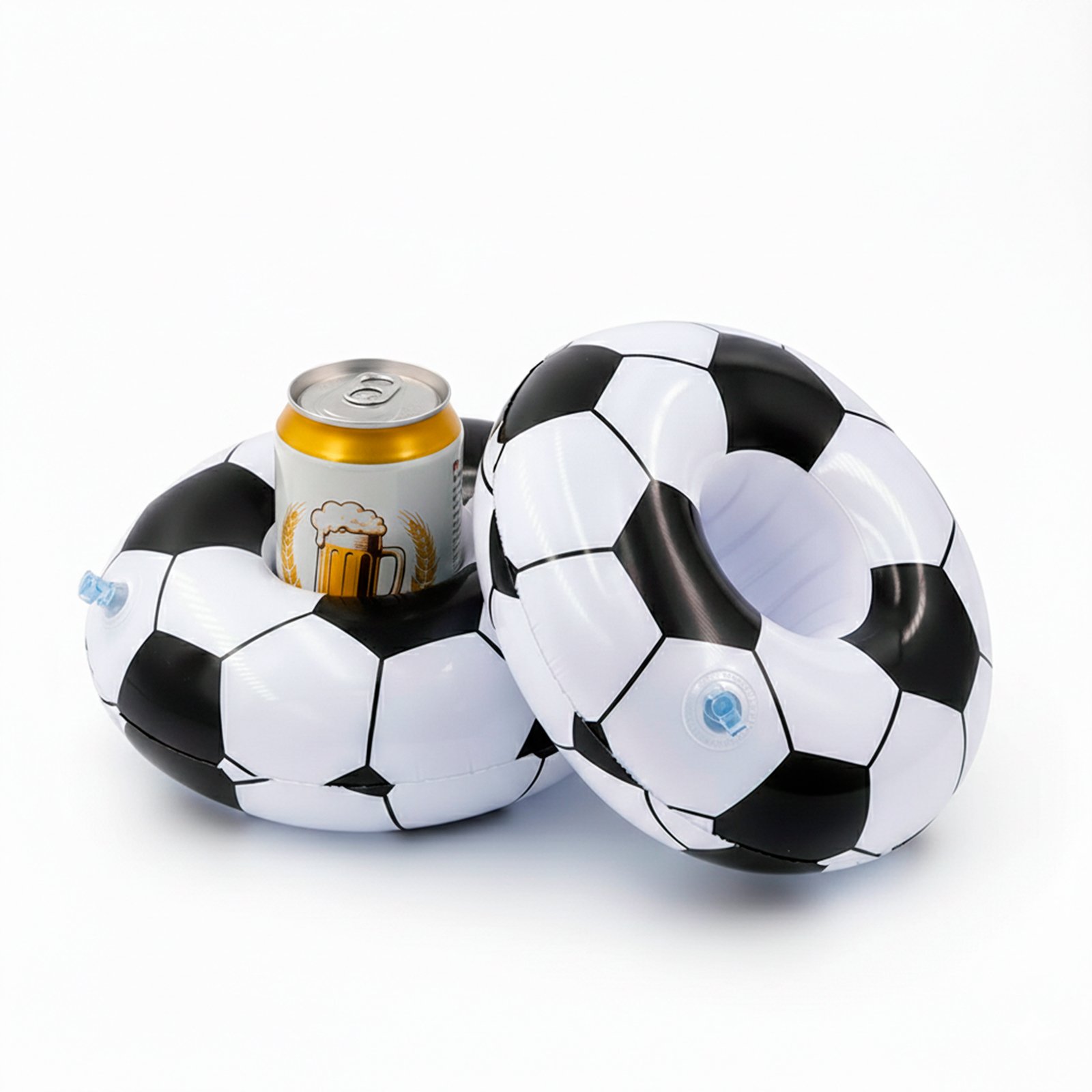 Soporte para bebidas inflable de 1 puesto con estampado de balón de fútbol. De 21cms de diámetro.