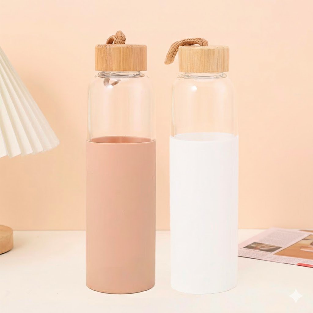 Botella de vidrio con sujetador en solicona resistente al calor. Tapa en madera de bambú con cordón para colgar.