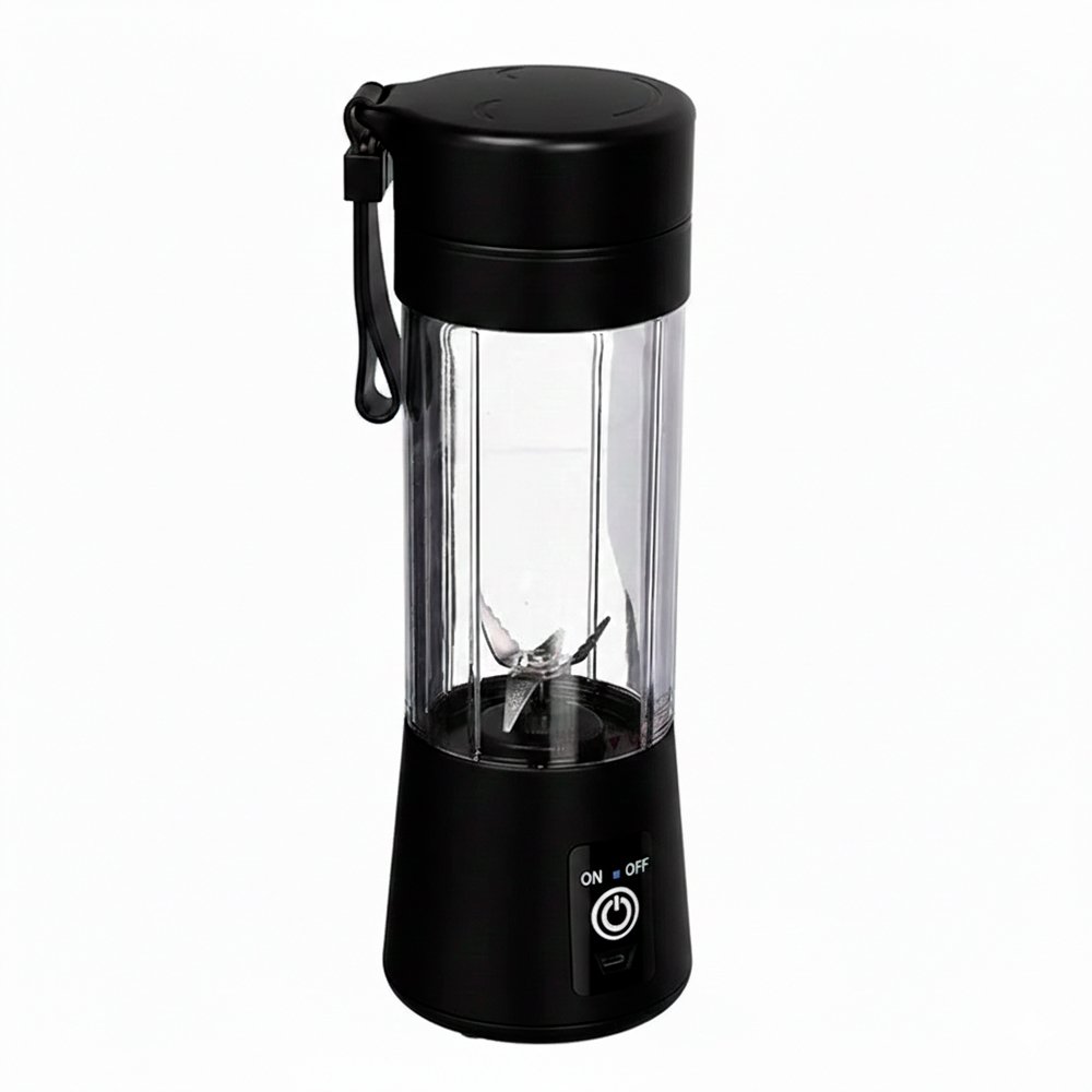 Vaso plástico doble pared con base en silicona. 6 Aspas en acero inoxidable para batidos livianos. Tapa removible. Potenica 38 W. Carga USB con cable incluído. Capadidad 400 ml. De 7.7 x 23 cm .